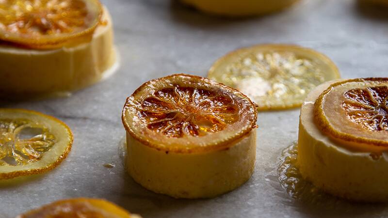 5. Cortar los limones en rodajas delgadas. En un sartén, idealmente de acero inoxidable, preparar un almíbar de pelo con el azúcar y agua, cuando llegue a ese punto, agregar las rodajas de limón, para que se impregnen bien de almíbar y dejarlas cocer por 10 minutos a fuego bajo o hasta justo antes de que se forme caramelo. Poner sobre una lámina de silicona o silpat y llevar a horno a 120°C, por 15 minutos. Dejar secar bien.