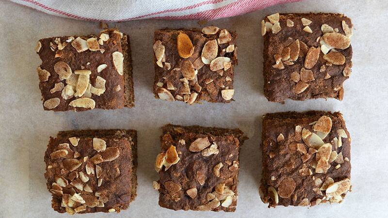 2. Agregar poco a poco la mezcla de harina en el bol con ingredientes húmedos y mezclar hasta que todo se incorpore bien. Una vez lista, llevar al molde previamente aceitado o con papel de cocina. Esparcir bien la mezcla en todo el molde, espolvorear canela encima y agregar almendras laminadas o el topping elegido. Hornear por 20 minutos o hasta que al enterrar un cuchillo, salga limpio.
