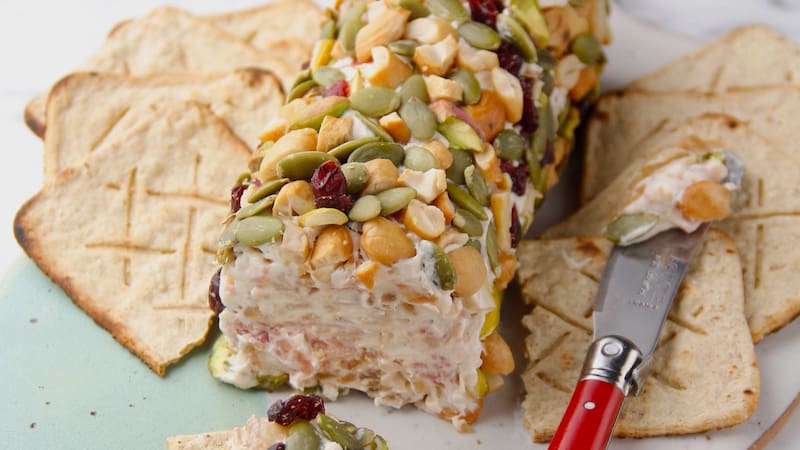 5. Finalmente, retirar el papel plástico y cubrir por completo el rollo con los frutos secos. Servir el rollo acompañado de galletas saladas.