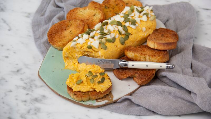 El rollo de zapallo camote que nos comparte el chef Joaquín Cerda es perfecto para comerlo con bagguette. Para lograr la forma, solo hay que cubrir una bandeja con aluza foil, luego con la preparación del queso y enrollarlo sacando siempre la parte de abajo del alusa para que no quede entremedio.