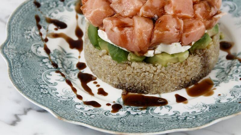 4. Colocar un aro de acero –de 10 cm de diámetro– en un plato, hacer una capa de quínoa y aplastar muy bien con una cuchara. Agregar un poco de palta y queso crema, y luego finalizar con una capa de salmón. Repetir este paso 3 veces más. Rociar la reducción sobre el timbal y servir.