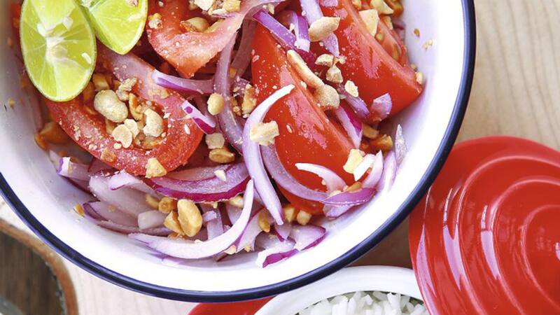 2. Para la ensalada, en un bol añadir el tomate, la cebolla, el maní y el vinagre, condimentar con sal, pimienta y dejar reposar durante 10 minutos