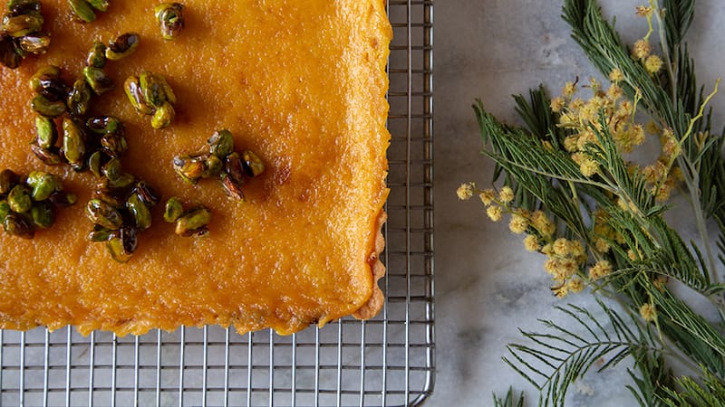 Esta tarta de limón en una receta de Isidora y Pilar Kraemer (creadoras de @clementina.chile) una vez fría, se puede decorar con los pistachos caramelizados antes de servir.