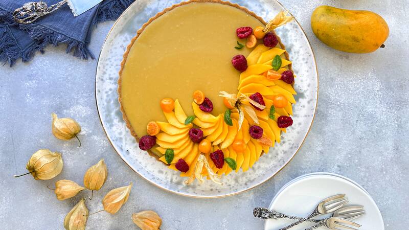 Esta tarta de mango y chocolate blanco es una idea perfecta para amenizar la semana probando algo nuevo y entretenido, porque cada paso es importante para lograr el objetivo final. La chef Franziska Rösner nos entrega tips reposteros para su receta, como por ejemplo, no amasar la masa de la base en un principio, sino que solo friccionarla con ambas manos. También pincharla con un tenedor antes de congelarla, y para el chocolate, la clásica técnica del baño maría. Además, con estas tartas siempre se puede jugar con la decoración: esta vez la chef probó un diseño bello con gajos de mango, albahaca, frambuesas y tomatitos cherry. También se puede jugar con lo dulce, y ponerle unos merenguitos, por ejemplo.