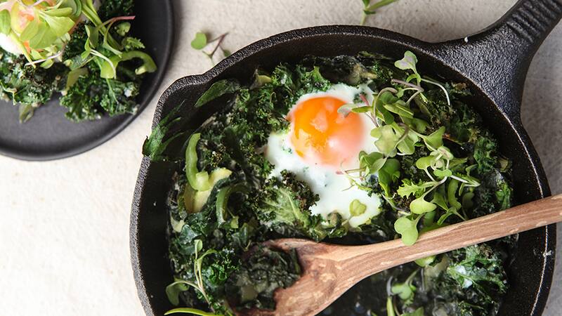 2. En un sartén apto para horno saltear el cebollín y el ajo molido con aceite de oliva y sal, revolver por unos minutos, añadir el pimentón y los zapallitos, poner el fuego alto para que se doren y el líquido de los zapallitos se evapore. Añadir las 2 tazas de hojas, el curry y mover con una cuchara, finalmente añadir el kale crespo, picado, revolver solo para untar con el resto de las hojas. Cocinar por 4 minutos y apagar el fuego.