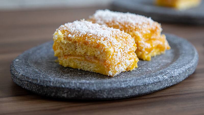 6. Para armar, cubrir 2 huinchas de biscocho con la crema de naranja, tapar con otro biscocho y bañar con mas crema de naranja. Terminar con coco rallado y cortar en 6 cada una.