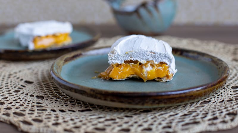 7. Para el merengue, poner las claras y el azúcar en un bol y llevar a baño maría batiendo, idealmente con batidora eléctrica, por 7 minutos, hasta que se forme un merengue bien duro, sacar del fuego, batir 1 minuto más para enfriar y luego cubrir los pasteles ya rellenos.