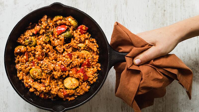 Cómo preparar pie de lentejas rojas, crema de coco y repollitos de bruselas