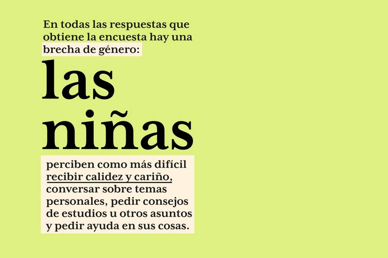 Y algo que llama la atención, según la directora de Observatorio Niñez Colunga, es que en prácticamente todas las respuestas se revela una brecha de género, donde las niñas tienden a percibir su vínculo con sus padres o cuidadores como más compleja. Al respecto, Del Villar reflexiona: “Es posible que las niñas sean más críticas al evaluar su relación con sus padres, ya que, en comparación con los niños, son más las que reportan dificultades para recibir apoyo o conversar sobre temas personales. Sin embargo, este análisis no puede ignorar que, según otras encuestas a nivel nacional como la de polivictimización, las niñas también reportan mayores niveles de maltrato por parte de sus cuidadores y a nivel de denuncias vemos una mayor tasa de niñas víctimas de violencia intrafamiliar”.