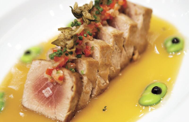 1. Sazonar los trozos de atún. Calentar un sartén antiadherente, sellar el pescado y dorar por todos sus lados, dejando el interior totalmente crudo. Transferir rápidamente y sumergir el pescado 1 minuto en agua con hielo, retirar y secar bien con papel absorbente. En una bolsa sellar al vacío, colocar el pescado junto a 1 cucharada de salsa ponzu. Reservar.