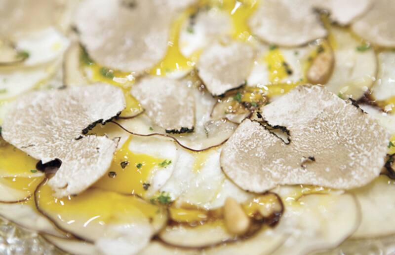 3. En platos individuales espolvorear un poco de sal, pimienta y aceite de oliva. Luego distribuir las láminas de hongos en forma decorativa, espolvorear el perejil y piñones tostados, rociar encima la salsa de yema reservada, otro poco de sal, unas gotas de aceto balsámico y finalmente las láminas de trufa. Servir de inmediato.