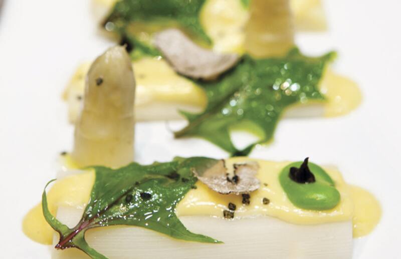3. En platos individuales distribuir los espárragos en forma decorativa, cubrir algunos trozos con la salsa holandesa y encima colocar hojas de espinaca y habas. Servir de inmediato decorado con las emulsiones Meloso de ternera. y láminas de trufa.