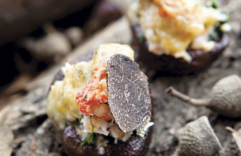 Hongos rellenos de centolla gratinados en salsa holandesa trufada.