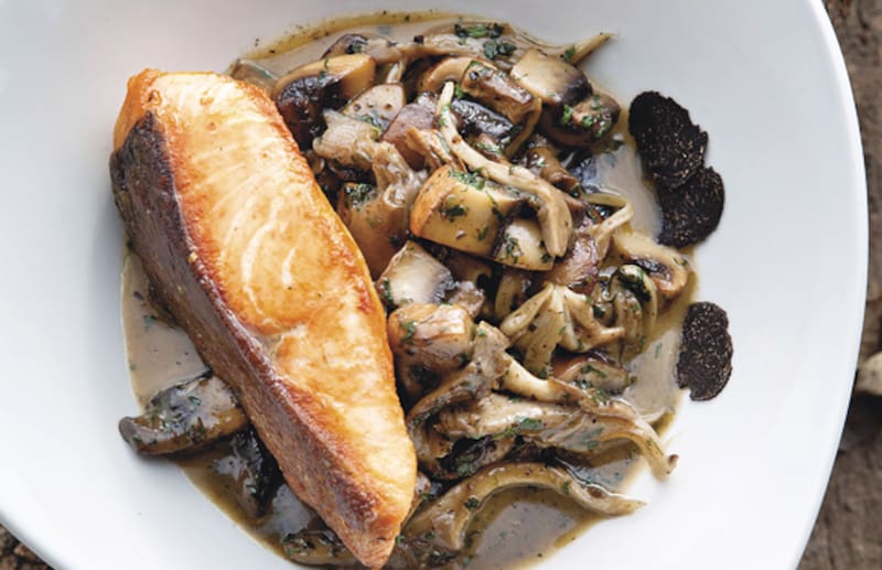 3. En platos individuales distribuir la mezcla de hongos, encima colocar el filete de salmón y decorar con berros y trufa fresca.