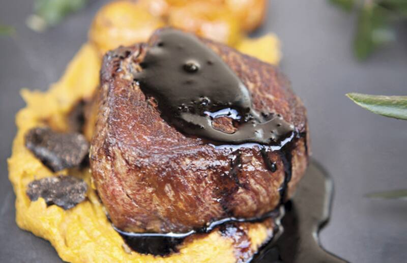5. En platos individuales distribuir el puré de camote, colocar encima un medallón de carne y tomates asados reservados. Rociar con el syrup de balsámico trufado, decorar con láminas de trufa y servir de inmediato.