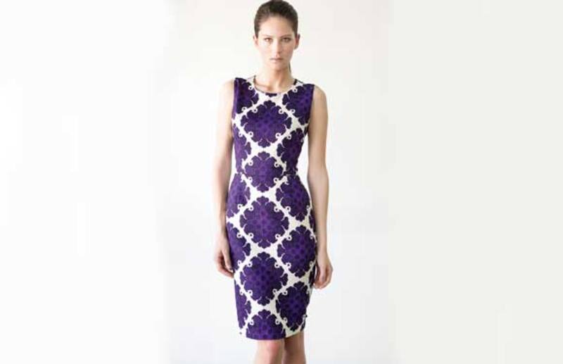 "La tela de este vestido es una de las que usé de referencia estética para mi nueva colección primavera-verano. El estampado evoca los azulejos de las terrazas de México, Lima, Bogotá y las que en Chile se pueden encontrar en el Barrio Italia. La paleta de color es fresca, femenina y elegante; púrpura, negro y mantequilla. Es ciento por ciento algodón italiano, aunque parece seda. La espalda está hecha con una viscosa que traje de São Paulo. Todas las terminaciones están hechas a mano", dice Neumann.
