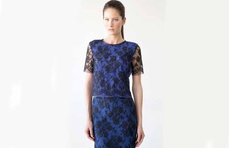 El top y la falda son de crepé de seda azul con encaje francés, este último empastado, nombre que se usa cuando un género se trabaja sobre otro y se unen a mano mediante un hilván que se saca al terminar el vestido, logrando un calce y caída perfectos. El encaje también es de seda, de Solstiss, una de las firmas más prestigiosas del mundo donde la casa inglesa Alexander McQueen compró el encaje para hacer el vestido de novia de Kate Middleton.
