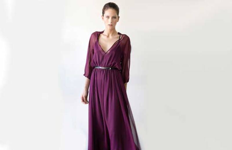 "Vestido en georgette de seda púrpura. Tiene aproximadamente 4 metros de género solo en la falda. El volumen aparece con el movimiento al caminar, de esta forma se logra en un vestido de fiesta una sensación etérea, femenina y chic. Tiene mangas dolmán, un sello de mi marca, que incorporo porque estilizan la silueta y los brazos se ven muy elegantes. El falso es una enagua de charmeuse de seda separado del vestido transparente que va sobrepuesto. La idea es que tengan un movimiento independiente", describe Neumann.