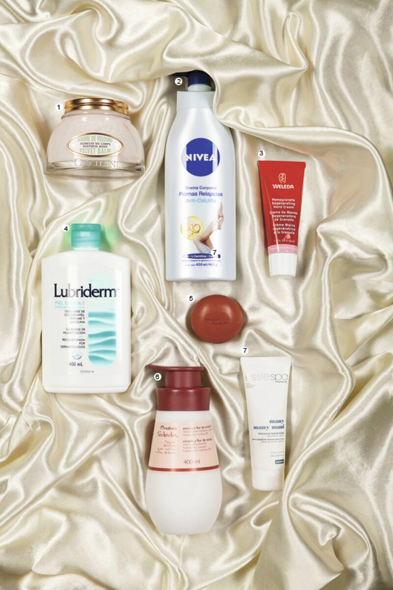 1. Leche corporal, $ 25.000, L'Occitane. 2. Crema corporal, $ 5.490, Nivea. 3. Crema de manos, $11.850, Weleda. 4. Crema corporal, $ 3.490, Lubriderm. 5. Set de cinco jabones, $ 5.990, Natura. 6. Hidratante corporal, $ 8.700, Natura. 7. Crema de manos, $ 6.490, Essie.