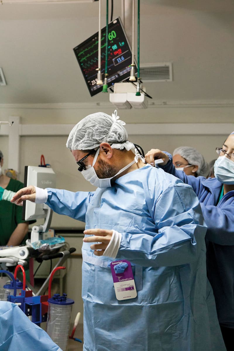 "Cuando entras a operar a un paciente del corazón es como despegar: tienes que saber que vas a poder aterrizar, porque, si no, la muerte es casi una certeza", dice Baeza, en la foto durante una cirugía de corazón abierto en el Hospital San Borja Arriarán.