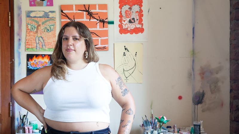 En general, mis procesos creativos van muy directamente relacionados a los procesos internos y personales que estoy viviendo. Con Crónica de emociones eso queda mayormente explicitado; el fondo me lo gané en octubre de 2022 y recién pude empezar a pintar en junio del 2023. No sabía qué pintar, me daba vueltas, me preguntaba si tenía algo que decir, si le importaría a la gente y si mi trabajo le gustaría a los demás. Al final, ¿qué fue lo primero que pinté? A mí misma, frente a un lienzo en blanco, sin saber qué pintar. Sé que puede sonar un poco auto referente pero el arte tiene mucho de eso; es el reflejo de una misma, de lo que una siente y vive. Lo cual es agotador, pero así es. Y quizás también son etapas.