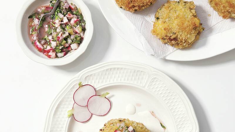 Croquetas de trucha ahumada, salsa criolla de rabanitos y crema ácida con rábano picante