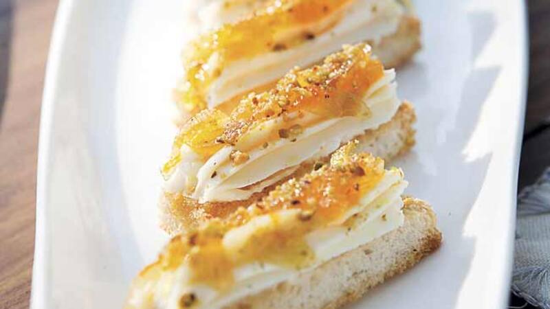 Crostini con cremoso de roquefort y mermelada de cebolla a la naranja y pistacho