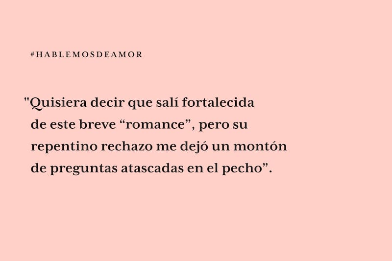 Quisiera decir que salí fortalecida de este breve “romance”, pero su repentino rechazo me dejó un montón de preguntas atascadas en el pecho, con la sensación de desconocer completamente a alguien que creía que estaba conociendo mucho. Creo que es necesario reflexionar sobre el concepto de responsabilidad afectiva. Llevarla a cabo no es ir por la vida haciendo lo que quiero, dañando a otros y después pidiendo perdón sin dar espacio a la reflexión.