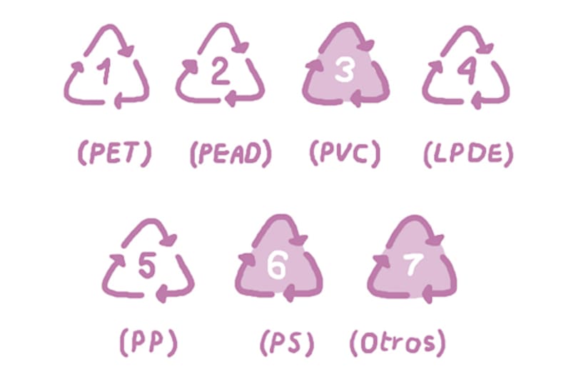 Hay que evitar los que tienen el número 3 (papel film transparente, botellas de aceite), 6 (vasos de plumavit, bandejas de carne) y 7 (bidones, mamaderas y botellas de policarbonato). Todos tienen ftalatos o BPA.