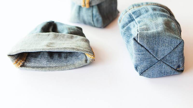 1. Cortar el blue jeans a la altura de las piernas para obtener 2 largos cilindros de tela.