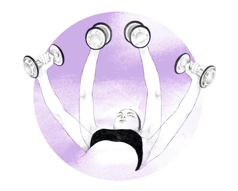 Clave: con una leve flexión de codos abrir los brazos lentamente con las mancuernas hasta sentir que los pectorales se estiran. Volver de forma controlada.