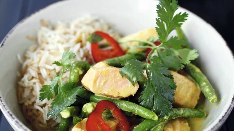 1. Calentar el caldo con la leche de coco. Disolver la pasta de curry en un poco de agua caliente y agregar al caldo. Sazonar con la pasta de tamarindo y la salsa de pescado. Incorporar el salmón y los porotos verdes, y cocinar por 5 a 6 minutos.