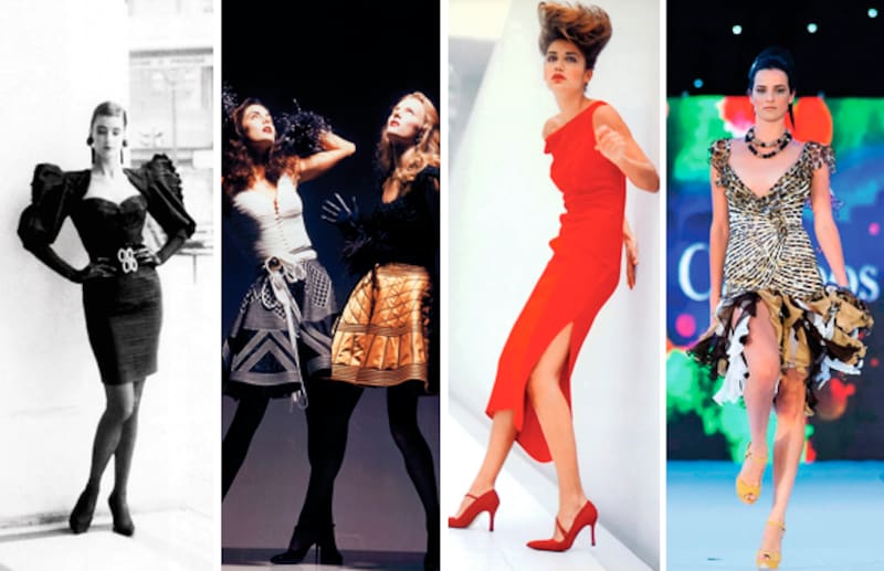 De izq. a der.: Diseño de los 80, Dos looks de los 90, Carolina de Moras con un diseño de la colección otoño del 2000, Parte de la última colección de Campos, en agosto de 2013. La modelo Renata Ruiz.