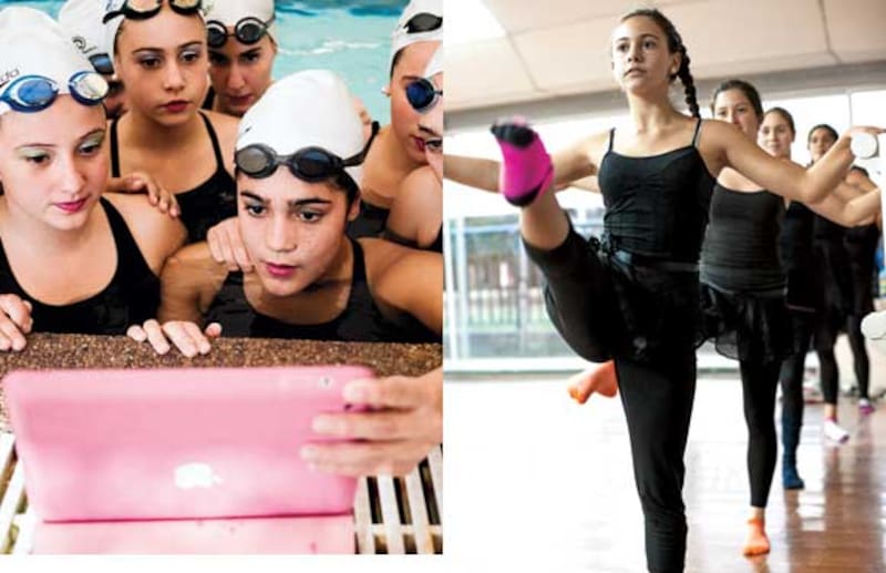 La Selección Nacional de Nado Sincronizado que se prepara para los Juegos Odesur 2014 está formada por 10 jóvenes de entre 14 y 23 años que practican todas las tardes –excepto el martes– en la piscina del Club Médico. Antes de lanzarse al agua tienen una hora de acondicionamiento físico: hacen abdominales, estocadas y mucha elongación para aumentar su resistencia y flexibilidad. Los miércoles tienen clases de ballet para perfeccionar la postura. A partir de diciembre entrenarán 8 horas diarias, seis días a la semana, durante todo el verano porque la competencia es en marzo. "El año pasado tampoco tuve vacaciones, pero lo pasamos bien. Tenemos un whatsapp del grupo y a veces hacemos pijamas parties", dice Isidora Letelier (14). En verano entrenan en la piscina exterior. "Usamos un protector solar industrial para la construcción que mi mamá compra en el Easy, pero igual quedamos negras", cuenta Daniela Costa.