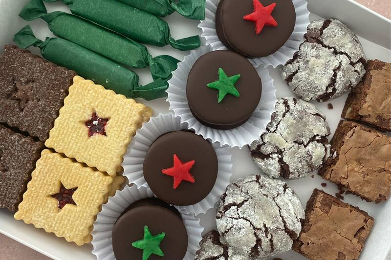 Para esta Navidad preparó unas cajas dulces que vienen con calugas de cola de mono, galletas linzer chocolate nutella, galletas linzer vainilla frambuesa, alfajores de mazapán, craqueladas de chocolate y brownie nuez. Una excelente opción para después de la cena y también para regalar.