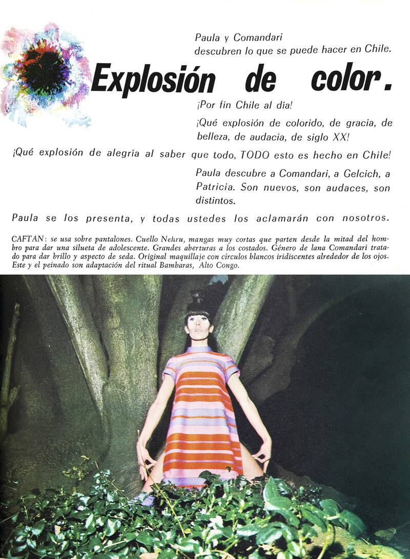 Para que no quedara duda de la vocación de Paula por la moda chilena, en el segundo número de la revista, en agosto de 1967, se fotografiaron vestidos hechos por boutiques chilenas con géneros de Textil Comandari, que reflejaban los colores, el brillo y las texturas que se imponían para una silueta más suelta y que miraba también a la India y a África.