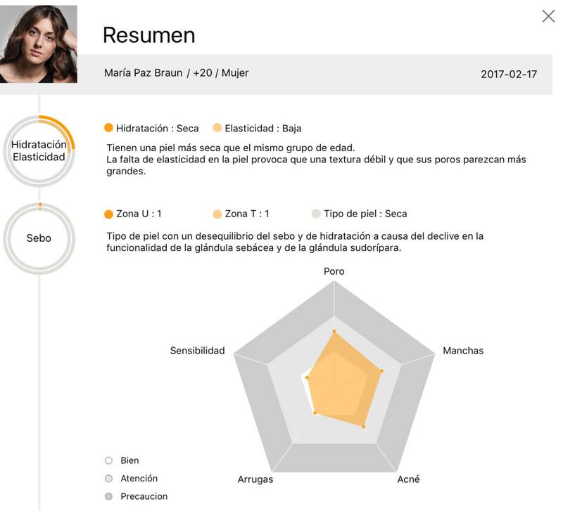 El diagnóstico, al que se recomienda llegar con la cara limpia, sin maquillaje ni factor solar aplicado recientemente, es el primer paso de esta experiencia. Se realiza con una maquinita con tecnología microscópica, armada de sensores que evalúan ocho variables al contacto con la piel: hidratación, elasticidad, sebo, poros, manchas, acné, arrugas y sensibilidad.