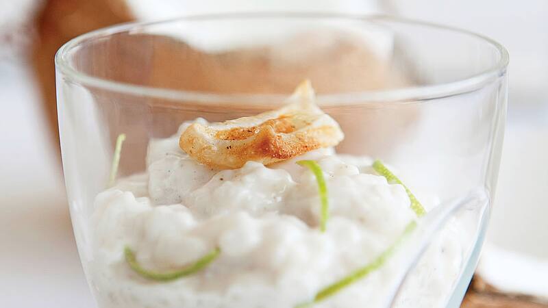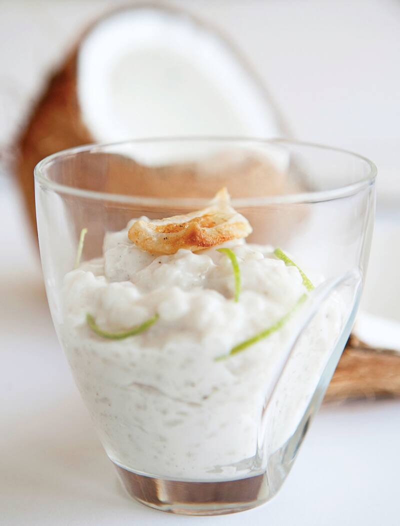 3. En copas o vasos individuales distribuir el arroz y decorar con el crocante de coco laminado, cáscara de limón y pizca de canela. Servir frío o a temperatura ambiente.