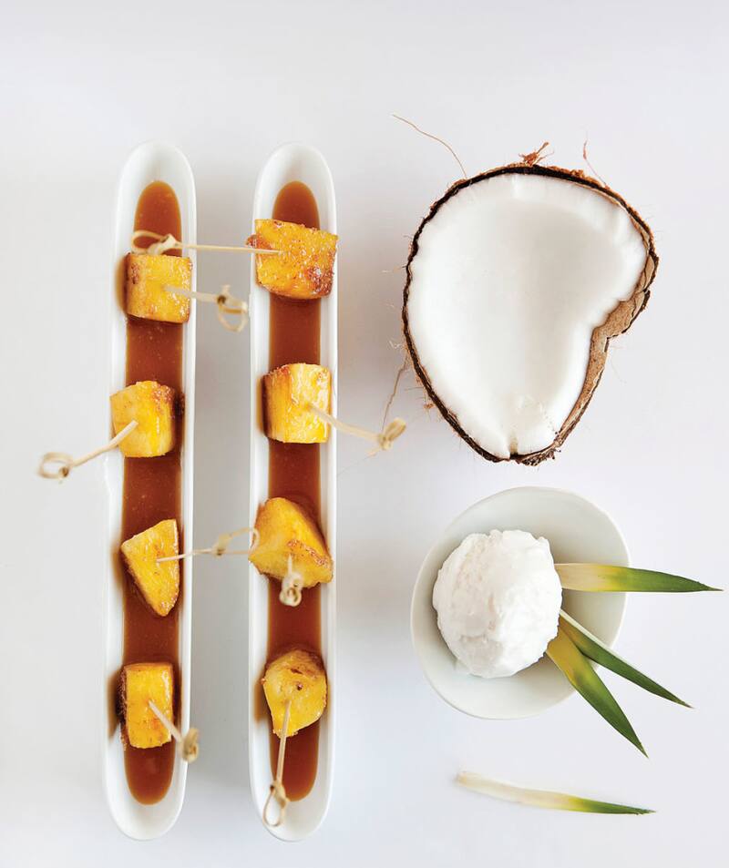 Brocheta de piña acaramelada, caramelo de coco y jengibre con helado de coco