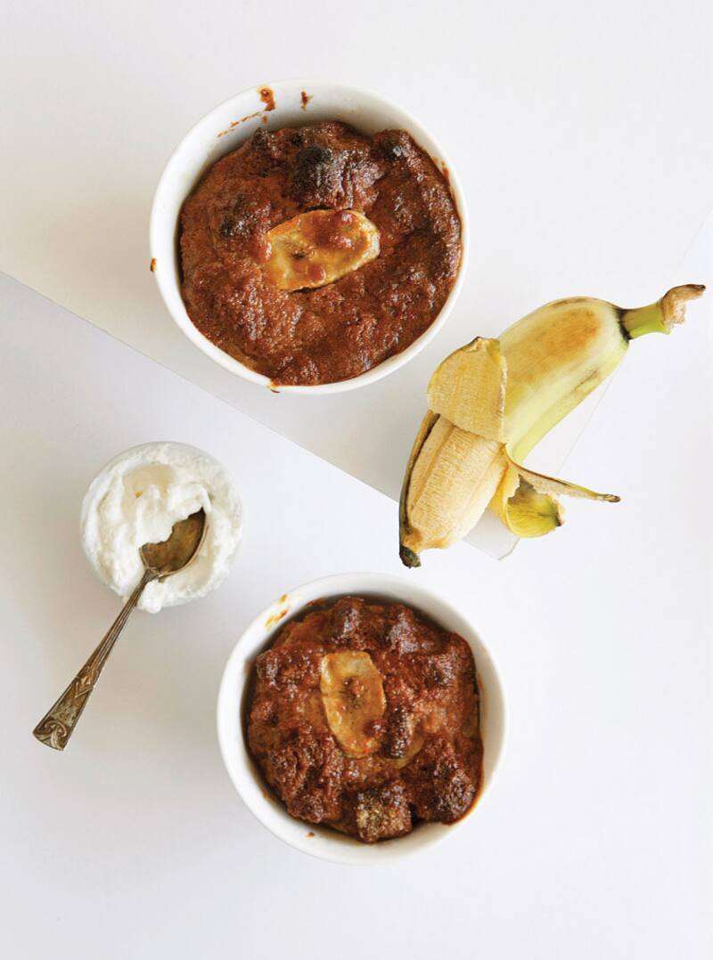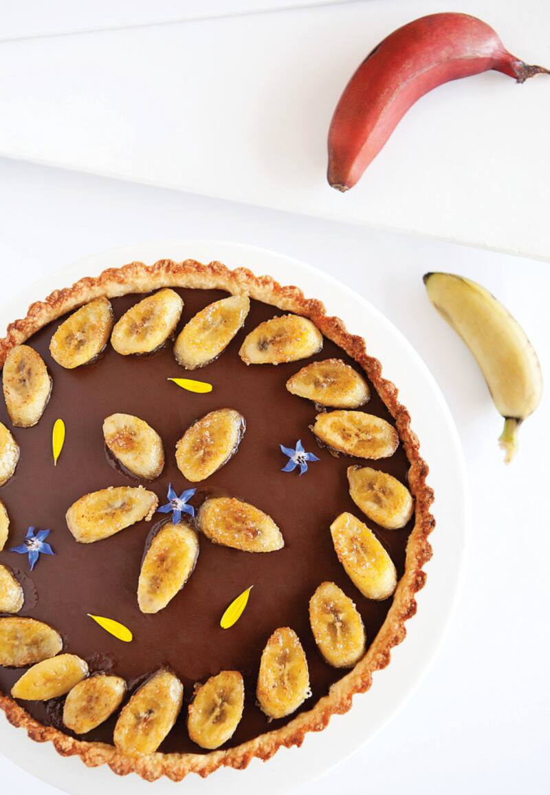 3. Antes de servir, pelar los plátanos y cortar diagonalmente en tajadas. En un sartén grande antiadherente calentar el resto de mantequilla a fuego medio, espolvorear el azúcar y cocinar hasta formar un caramelo. Colocar las tajadas de plátano y cocinar hasta dorar por ambos lados. Dejar enfriar y distribuirlas en forma decorativa sobre el