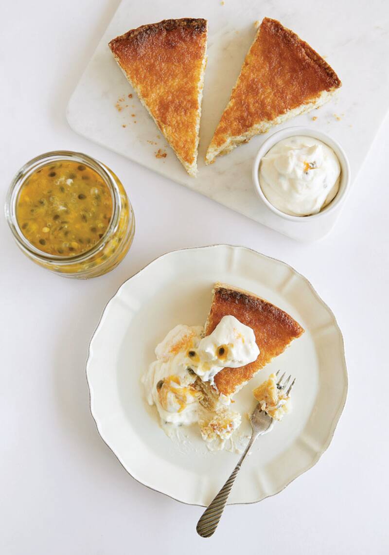 4. Mientras tanto, preparar la crema de maracuyá. En un bol batir la crema, azúcar flor y crema ácida hasta espesar. Agregar la pulpa de fruta y batir 1 minuto más. Servir la torta con la crema de maracuyá