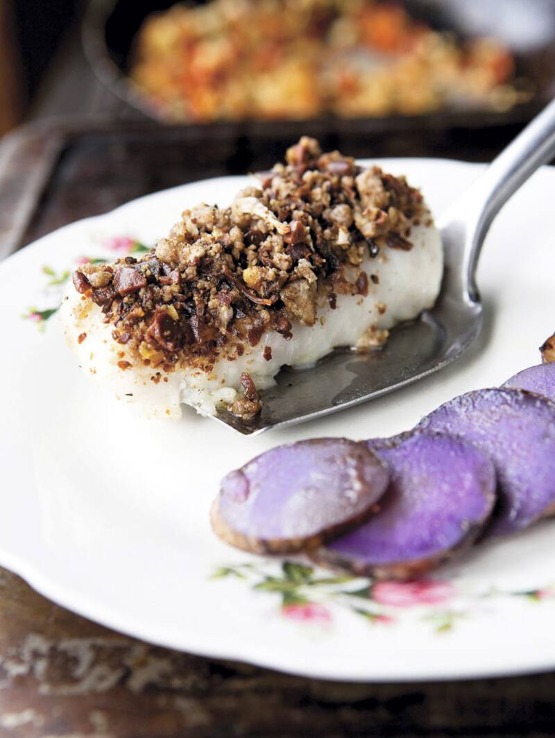 2. Cubrir cada filete de merluza con una capa de la mezcla de cholgas, colocarlas en una budinera aceitada y hornear a temperatura media–alta, 8 minutos. Servir de inmediato acompañado de las papas.