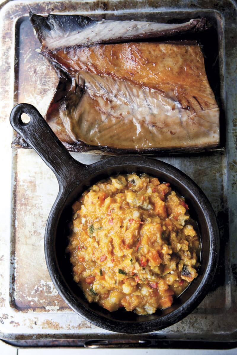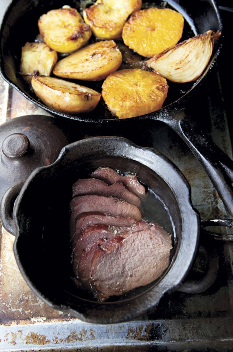 3. Cortar el chanchito en tajadas y rociar con el líquido de cocción. Servir acompañado de las frutas acarameladas calientes, espolvoreadas con unos granos de sal de mar. Servir de inmediato.