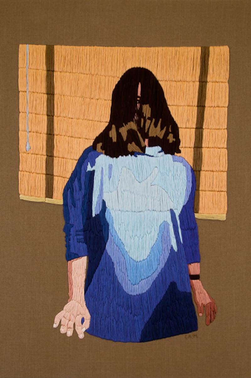Los bordados de Carlos Arias acusan su formación como pintor. Luces y sombras, atmósferas y climas emocionales se reproducen en esta obra titulada Mujer cíclope, 2014. 60 x 45 cm.