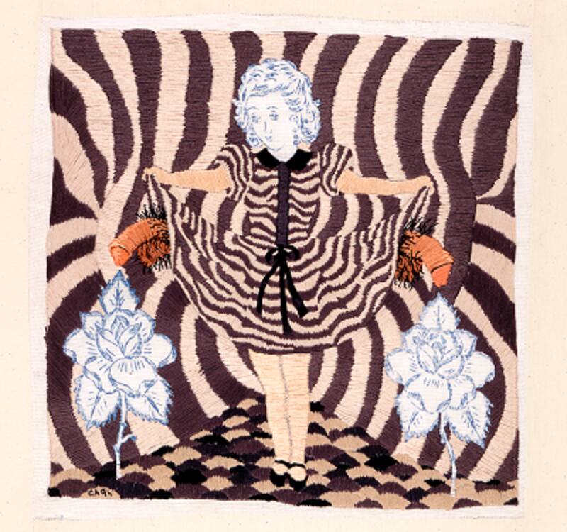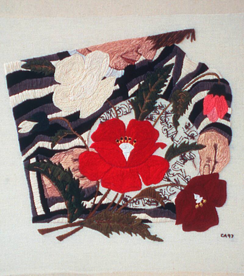 El bordado como técnica artesanal asociado a lo femenino se tematiza envarios de sus trabajos. Este se titula Niña fertilizadora, 1994. 53 x 64 cm.