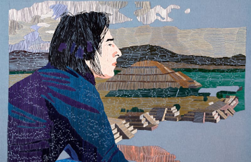 El trabajo de Arias atañe al tiempo y la memoria, al recuperar desde el pensamiento contemporáneo una práctica arcaica, como el bordado. Esta obra, dedicada a su hermano, se titula Claudio observando el futuro de la civilización, 2014. 60 x 80 cm.