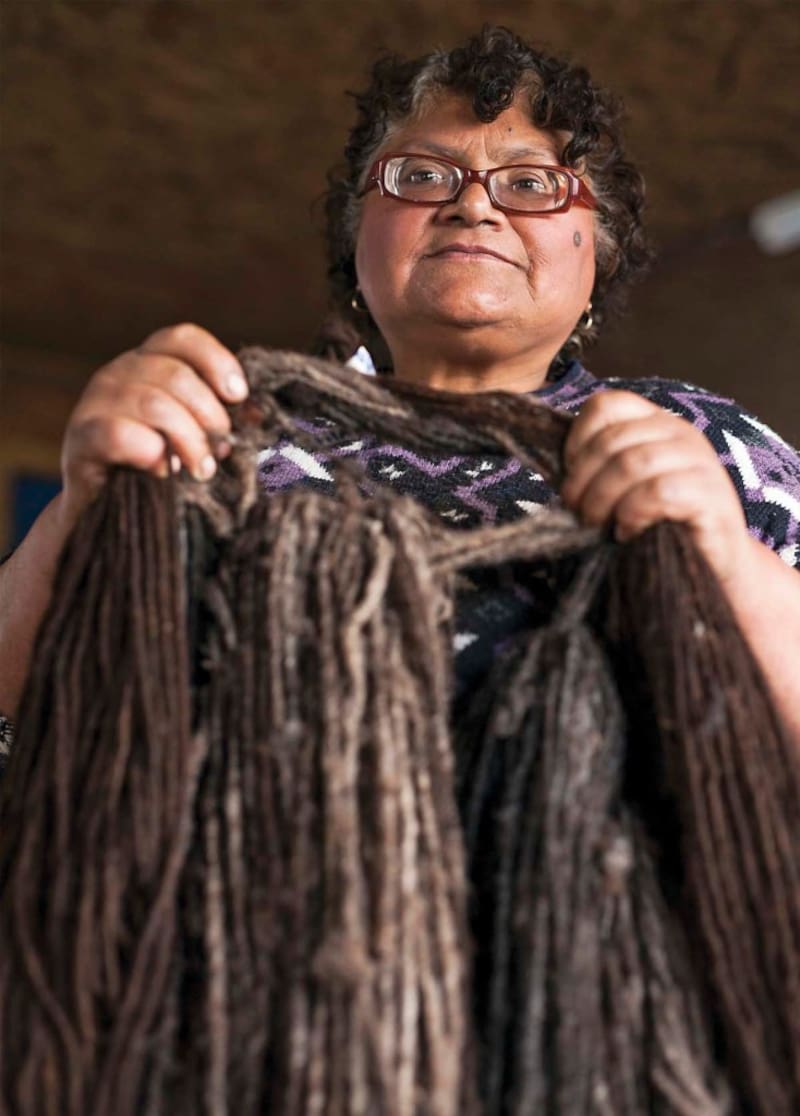 Elizabeth estudió Técnico en Enfermería pero lo dejó. Entonces volvió a la lana. De eso hace siete años. "Tengo 15 ovejas en mi casa a las que cuido mucho para que me den buena lana: las alimento bien, les doy mucha agua y les tengo un cobertizo para que pasen la noche. Hilo la lana que me dan, pero también compro porque no me alcanza con mis ovejas. Tejo a telar frazadas y bajadas de cama. Estoy orgullosa de ser parte de la tradición textilera chilota".