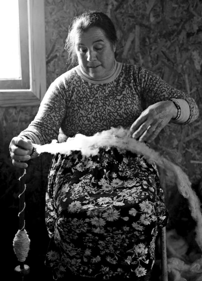 Afuera hace frío. Adentro, la cabaña está tibia. Hay 14 mujeres sentadas estirando las fibras del vellón, adelgazándolo mientras hacen un movimiento con sus brazos y enrollando las hebras en un huso de alerce que gira en el piso. Solo una, Purísima Barrientos (39), quien es de las más jóvenes, usa una rueca: ese rudimentario aparato que aparecía en la película de La Bella Durmiente.