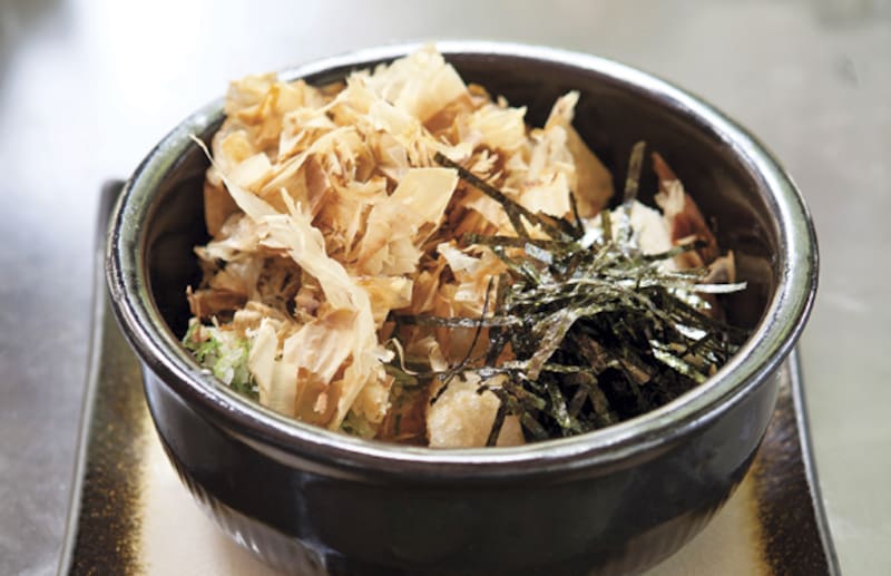 2. En un pocillo colocar el caldo tempura caliente, distribuir el tofu reservado, agregar el rábano, cebollín, jengibre y bonito seco. Decorar con nori y servir de inmediato.