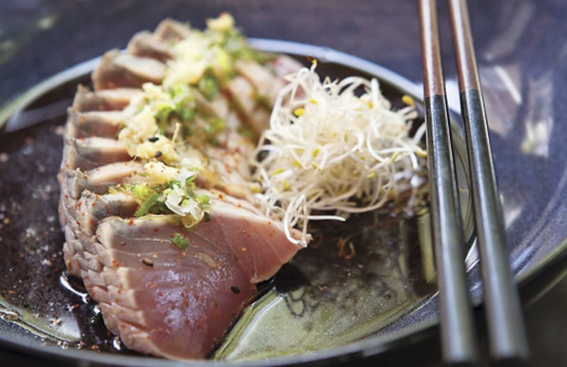 2. En una superficie lisa cortar el trozo de pescado en corte sashimi, distribuir en un plato, rociar con la salsa ponzu y encima agregar el cebollín y jengibre. Decorar con los brotes y servir de inmediato.